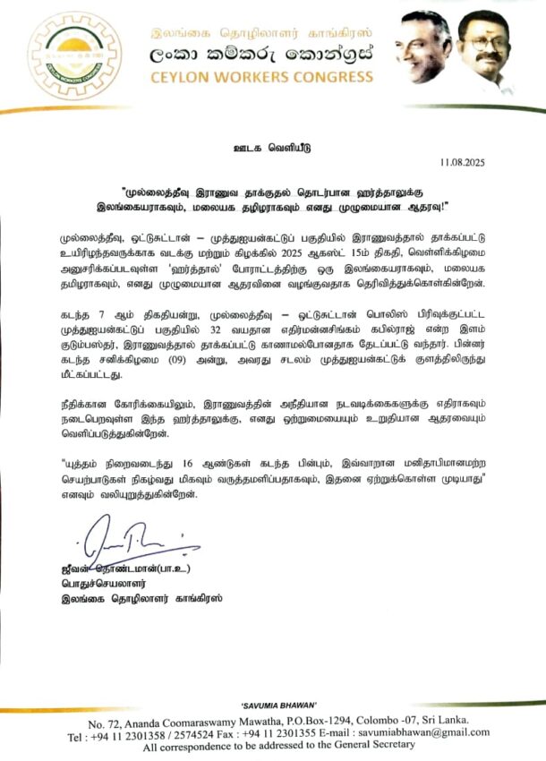 ශ්රී ලංකා යුධ හමුදාවට එරෙහිව උතුරු නැගෙනහිර සිදුකරන හර්තාල් ව්යාපාරයට ලංකා කම්කරු කොංග්රසයේ පුර්ණ සහයෝගය දක්වන බව එම පක්ෂයේ මහ ලේකම් ජීවන් තොන්ඩමන් මාධ්ය නිවේදනයක් නිකුත් කරමින් සදහන් කරයි.